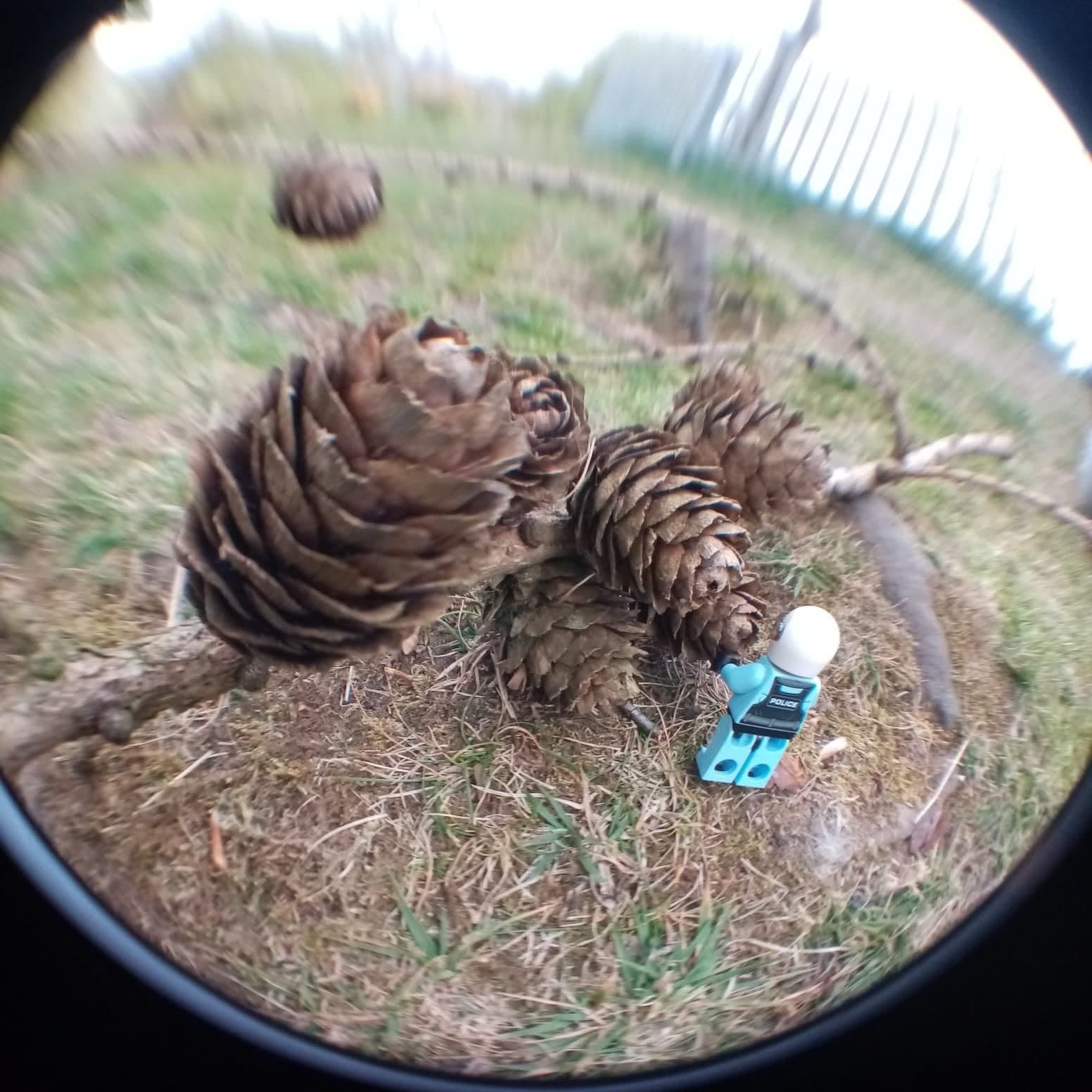 Looking at your close-up photo of an 'alien landscape' within your home, can you describe what the LEGO person is seeing, but without using any of the names of the things in the picture?